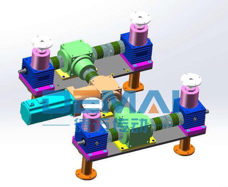 滾珠絲桿升降機同樣可以多臺聯動使用,今天我們就四臺聯動的方案和大家講一下滾珠絲桿升降機搭配伺服電機的優勢。讓廣大機械工程師對于方案的設計有更多的思路和想法。 如圖所示,整個方案采用的是四臺滾珠絲桿升降機聯動,升降機采用絲桿運動形式,并且頭部配有法蘭接盤。升降機通過聯軸器和轉向箱連接在一起。為了保證升降機與轉向箱在同一水平線上,我們使用了升降機加裝安裝板來實現。由于客戶對于精度有著極高的要求,我公司生產的升降機精度就很高,再加上我們在驅動源的選擇上,為其選了精度更高的伺服電機,以及精密行星減速機,這樣整套方案的精度可到0.05mm之內,讓客戶非常滿意。